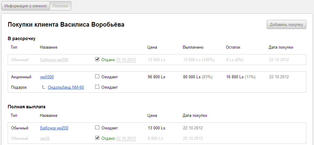 Карточка клиента разделена на две части: “Информация о клиенте” и “Покупки”.