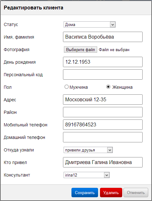 редактировать такие данные как пол, день рождения, адрес, “Откуда узнали”, “Кто