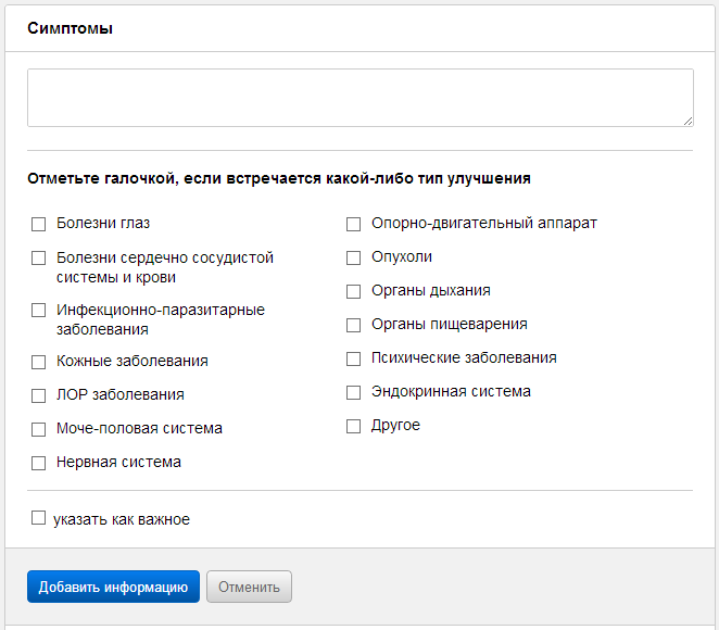 “Сохранить”, чтобы добавить симптом, или “Отменить”. “Улучшения” работают так же,