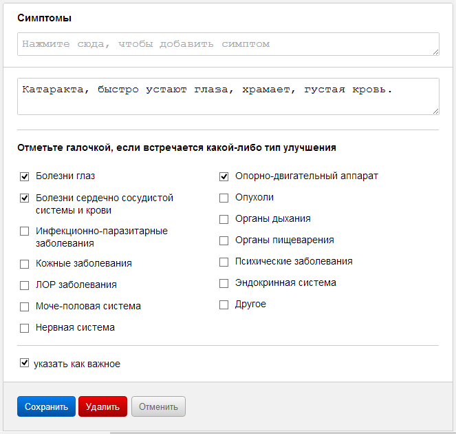 Для редактирования или удаления симптома, нажмите на текст симптома, затем измените