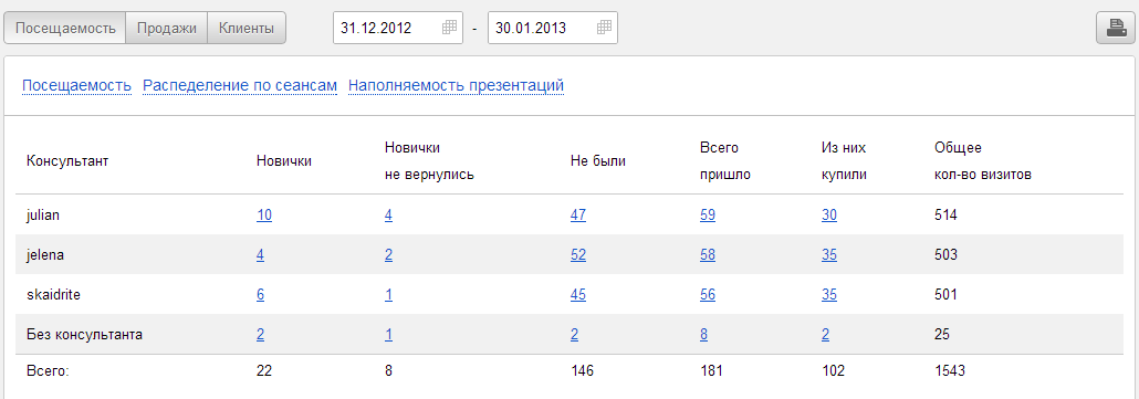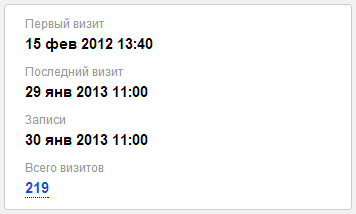 визит, Последний визит, Записи и Всего визитов. Если нажать на линк с цифрой, указывающей общее количество визитов в блоке “Всего визитов”,