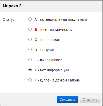 выставляется “Статус”, где мы выбираем этап, на котором находится посетитель, второе