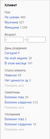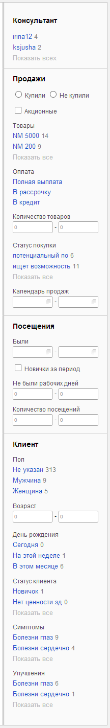 В блоке “Визиты” содержится вся информация о визитах клиента, такая как Первый