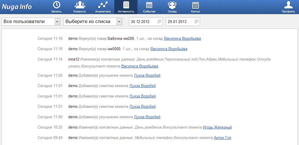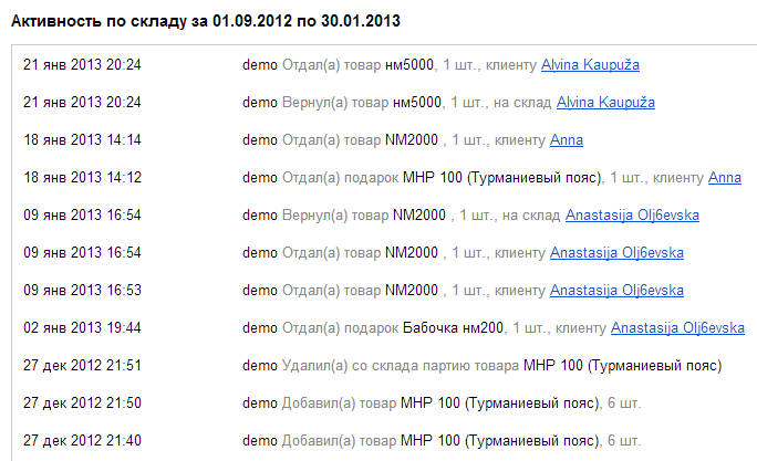 На странице активности Вы видите все действия, совершённые на складе. Используя