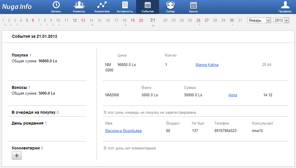 В разделе “Касса” фиксируются все кассовые движения зала. Касса разделена на части: “Полная выплата”, где фиксируются покупки за полную сумму; раздел “Рассрочка” – открытые рассрочки, “Кредит”, “Общая”, где суммируются предыдущие колонки, “Год” – данные по месяцам и “Консультанты” – данные о продажах в деньгах по консультантам. В каждой вкладке Вы можете использовать календарь, чтобы выбрать нужные даты. Кнопка “Сегодня” включает сегодняшний день, а кнопка с названием месяца – текущий месяц. -