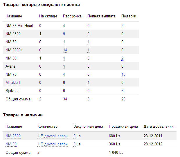 Первая таблица “Товары, которые ожидают клиенты” показывает посетителей,