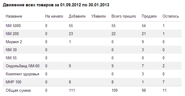 Вверху страницы Вы можете выставить нужную дату в календарях. Первая колонка таблицы “Движение товаров” – это название товара. Далее идет колонка “Было на начало”, показывающая, сколько товара было на балансе склада на начало выставленного Вами периода. Следующая колонка “Добавили” говорит о количестве вручную добавленного товара, это же значит и колонка “Убавили”. Колонка “Из салонов” показывает, сколько оборудования пришло к Вам из других салонов. Обратите внимание, что эта колонка появится у Вас только в том случае, если Ваш салон объединён “Платформой собственника”. Узнать подробней о платформе собственника Вы можете в одноимённом разделе инструкции. Колонка “Всего пришло” суммирует предыдущие колонки. Колонка “Продали” говорит о том, сколько товара было отгружено со склада по продаже. Колонка “В салоны” показывает, сколько товара Вы отправили в другие залы. Обратите внимание, что эта колонка появится у Вас только в том случае, если Ваш салон объединён “Платформой собственника”. Узнать подробней о платформе собственника Вы можете в одноимённом разделе инструкции. Колонка “Осталось” показывает, сколько товара осталось на конец выбранного Вами периода.