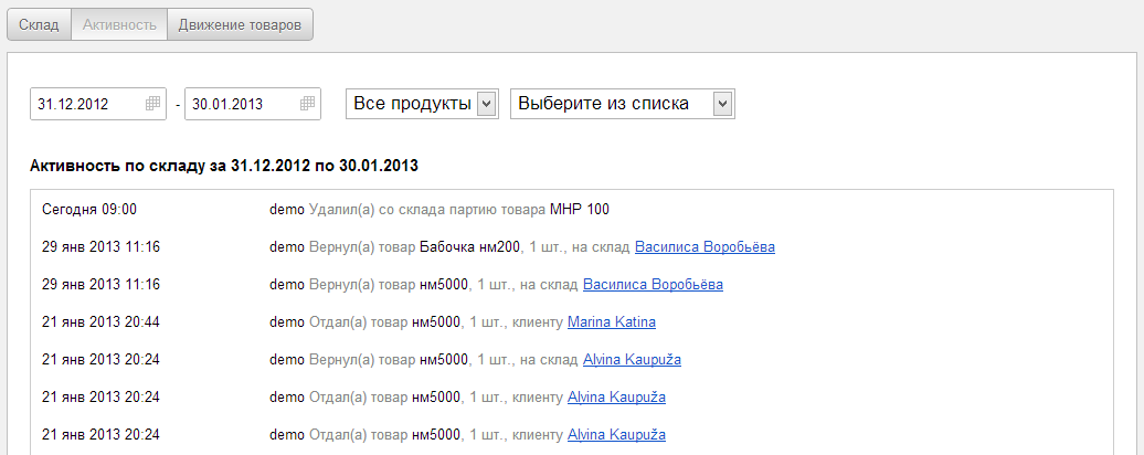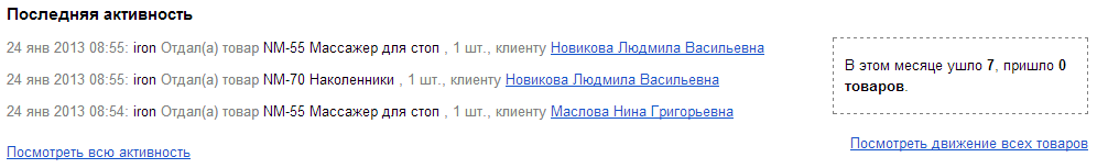 перейдёте на вкладку склада “Активность”, где сможете просмотреть полную активность.