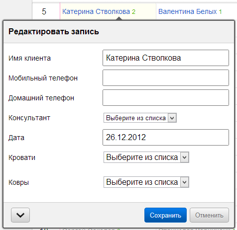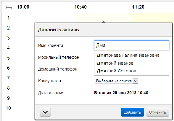 клиента, потом нажмите кнопку “Сохранить”, после чего запись будет произведена, или
