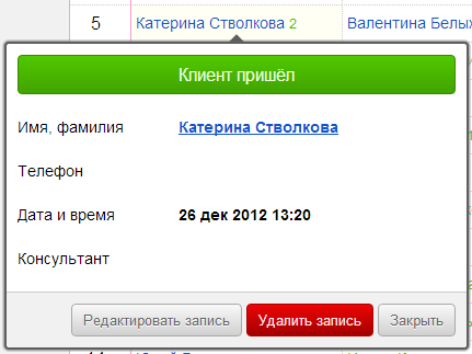 Для того, чтобы отметить приход посетителя, нажмите на ячейку с его записью и в открывшемся окне нажмите большую зелёную кнопку “Клиент пришёл”. После этого визит будет засчитан.