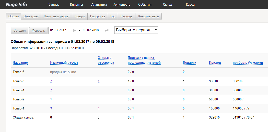 Раскрывает все движение денег, количество проданного товара и услуг по таким категориям как “рассрочка”, “кредиты”, “полная выплата”. Отображает информацию о расходах и прибыли с возможностью фильтрации по времени и товарам.
